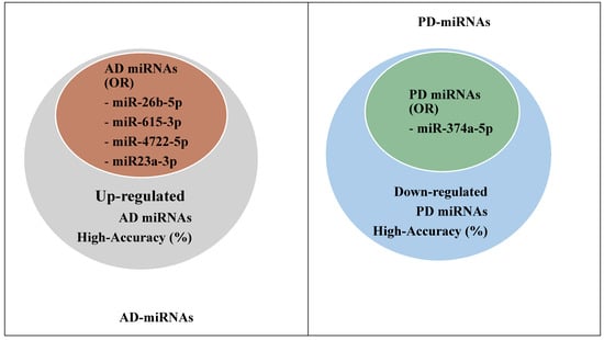 Additionally, from the total number of miRNAs identified (90 AD and 54 PD) which have the highest chances (Odds Ratio) of being identified by qPCR, a regression analysis was performed, which indicated five (5) miRNAs—miR-26b-5p (up-regulated), miR-615-3p (up-regulated), miR-4722-5p (up-regulated), miR23a-3p (up-regulated), and miR-27b-3p for AD, with OR = 2.55 (1023–3432) and p = 0.004 < 0.05, and only one (1) miRNA related to PD, miR-374a-5p (down-regulated), with OR = 2.16 (0.087–3.567) and p = 0.0035 < 0.05. After crossing the information, the results showed that all miRNAs (AD and PD) that presented the highest chances of being identified by qPCR (Table 9) are included in the groups of the prominent miRNAs with high accuracy (%), except for miR-27b-3p, belonging to the AD group of Table 9, as shown in Figure 4 of this study. These findings strongly highlighted the main miRNAs as biomarkers and therapeutic targets for AD and PD, thus contributing to future studies of advanced therapy with anti-miRNAs or antigenic modulation through vectors such as mesenchymal stem cell exosomes [,,], as well as for pharmacological therapies [,,,].