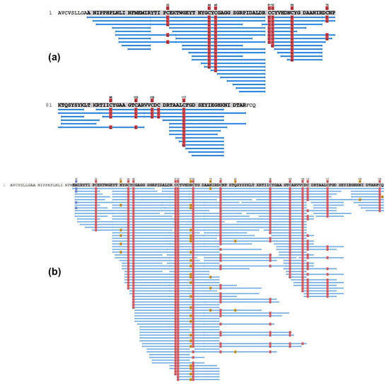 - Ma, B.; Zhang, K.; Hendrie, C.; Liang, C.; Li, M.; Doherty-Kirby, A.; Lajoie, G. PEAKS: Powerful software for peptide de novo sequencing by tandem mass spectrometry. Rapid Commun. Mass Spectrom. 2003, 17, 2337–2342. [Google Scholar] [CrossRef] [PubMed]