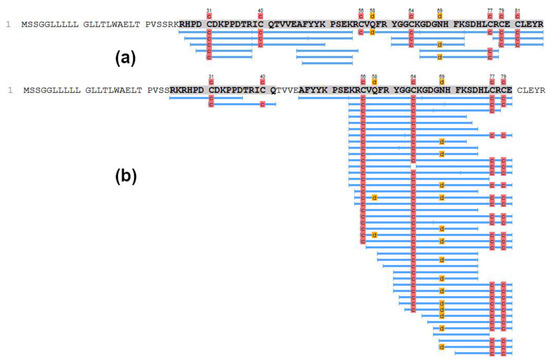 - Schnaible, V.; Wefing, S.; Resemann, A.; Suckau, D.; Bücker, A.; Wolf-Kümmeth, S.; Hoffmann, D. Screening for disulfide bonds in proteins by MALDI in-source decay and LIFT-TOF/TOF-MS. Anal. Chem. 2002, 74, 4980–4988. [Google Scholar] [CrossRef] [PubMed]