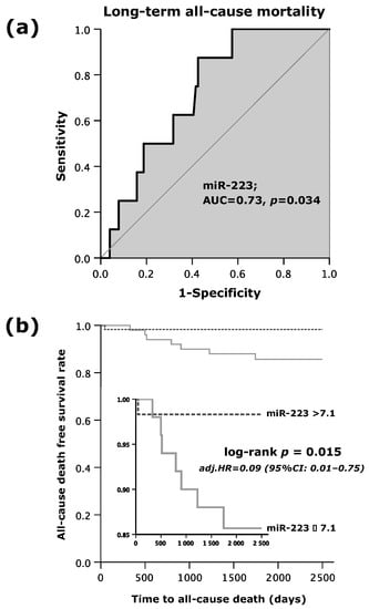 (a) Receiver operating curve (ROC) analysis for microRNA (miR)-223 to predict long-term all-cause mortality; and (b) Kaplan–Meier survival analysis for long-term all-cause mortality regarding high or low values of miR-223.