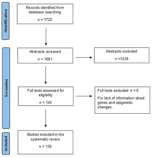 A total of 1722 articles were screened by title, abstract, and full text by the authors (Y.F.H. and E.A.O.) (Figure 1). All studies concerning genetics and epigenetics in English for which full text was available were included in the review. Exclusion criteria comprised the following: review articles and conference proceedings. The first reviewer (Y.F.H.) extracted the following data from all included studies: (1) study, (2) gene, (3) polymorphism, (4) DNA methylation, (5) miRNA, (6) upregulation/overexpression, and (6) downregulation. This was later reviewed by the second reviewers (E.A.O., S.K. and K.A.M.).