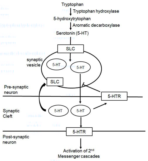 To understand the associations between 5-HT and FM, a review of 5-HT biosynthesis and physiology is needed (Figure 2). Tryptophan hydroxylase converts tryptophan into 5-hydroxytryptaminae (5-HTP). Aromatic decarboxylase converts 5-HTP into 5-HT. 5-HT is transported to storage in the presynaptic vesicles by the vesicular monoamine transporter (SLC18A2: Solute carrier family 8A member 2). When 5-HT is released into the synaptic cleft, it interacts with post-synaptic 5-hydroxytryptamine receptors (5-HTR1, 2, 3A, 4, 6, and 7) to activate secondary messenger cascades. Simultaneously, 5-HT stimulates presynaptic 5-HTR1 in a negative feedback loop to inhibit further release of 5-HT and interacts with solute carrier family 6 member 4 (SCL6A4) to transport synaptic 5-HT back into the pre-synaptic neuron []. 5-HT is also transported back into the pre-synaptic neuron by the serotonin transporter (5-HTT) []. Inhibitory serotonergic 5-HT1A receptors in the presynaptic neurons become activated and decrease serotonergic signalling [].