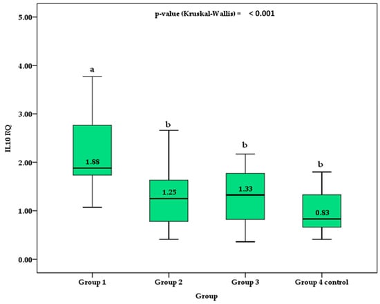 Comparison of the median and interquartile range (box) of IL-10 RQ between groups. Different superscript letters indicate a significant difference between the means by the post hoc Holm–Sidak test for p-value < 0.050. Different superscript letters indicate a significant difference between the means by the post hoc Holm–Sidak test for p-value < 0.050.