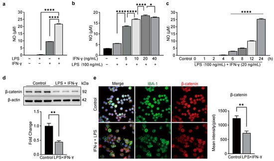 To test whether the Wnt3a/β-catenin signaling pathway participates in microglia-induced neuroinflammation, we used a model of BV-2 cells that exhibits morphological and functional features similar to primary microglia [1,2]. We used LPS at 100 ng/mL [24,25,26]. Through Griess reaction assays, we found that NO concentration in the supernatants of unstimulated BV-2 cells ranged from 0 to 5 µM. Furthermore, compared with separate incubation with LPS or IFN-γ, combined incubation with 100 ng/mL LPS and 20 ng/mL IFN-γ led to higher NO production in BV2 cells, with supernatant concentrations reaching roughly 20 µM (Figure 1a). IFN-γ accelerated the release of NO in a dose-dependent manner from 0 to 20 ng/mL, while 40 ng/mL IFN-γ caused a slight decrease of NO instead compared to 20 ng/mL IFN-γ (Figure 1b). The time course of NO production increased significantly within 6 h after LPS and IFN-γ exposure and peaked at 24 h (Figure 1c). Based on these results, we treated BV2 cells with 100 ng/mL LPS and 20 ng/mL IFN-γ for 24 h during the follow-up study.