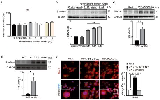 Western blot analysis showed that Wnt3a at 2 μM, 4 μM, and 8 μM, significantly increased the protein level of β-catenin (Figure 2b), suggesting that RM Wnt3a can induce the accumulation of β-catenin in BV-2 cells.