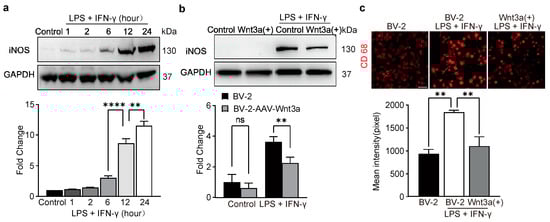 iNOS is one of the critical pro-inflammatory cytosine that catalyzes NO production and modulates immune activation by promoting the synthesis of inflammatory factors [8,9,10]. Our Western blot analysis showed that the expression of iNOS significantly increased following combination treatment of LPS and IFNγ for 6 h and the expression peaked at 24 h (Figure 3a). Interestingly, our results showed that the increased expression of iNOS following LPS and IFNγ treatment for 24 h was significantly inhibited in the Wnt3a-overexpression BV-2 cells (Figure 3b).
