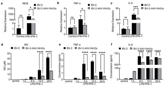 Next, we examined the impact of activation of the Wnt/β-catenin pathway on the pro-inflammatory activation of BV-2 cells. ELISA and qRT-PCR assays were used to analyze the level of iNOS, TNF-α, and IL-6. Our results showed that LPS/IFN stimulation significantly increased the mRNA levels of iNOS, IL-6, and TNF-α in BV-2 cells, such an increased mRNA level was reversed by Wnt3a overexpression (Figure 4a–c). Meanwhile, the release of NO, IL-6, and TNF-α in the supernatants was decreased in the Wnt3a-overexpressed BV-2 cells (Figure 4d–f). These results indicate that the Wnt3a/β-catenin pathway can counteract pro-inflammation responses by inhibiting the expression of pro-inflammatory cytokines.
