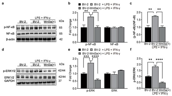 NF-κB is an essential protein that causes inflammation by controlling the production of pro-inflammatory cytokines [17,18,28,29]. To clarify the mechanisms underlying the anti-inflammatory effect of the Wnt3a/β-catenin signaling, we assessed the effects of Wnt3a overexpression on LPS/IFN-γ-induced phosphorylation of NF-κB in BV-2 cells. Our results showed that the phosphorylation of NF-κB was significantly reduced (Figure 5a–c), while the baseline level of proteins was unaffected. Moreover, the expression of iNOS expression in microglia mainly depends on the activation of ERK1/2 [19]. Our results further showed that the phosphorylation of ERK1/2 was decreased in Wnt3a-overexpressed BV-2 cells (Figure 5d–f). These findings indicate that activation of the Wnt3a/β-catenin pathway can inhibit the pro-inflammatory in LPS/IFNγ-stimulated BV-2 cells by limiting the activities of NF-κB and ERK1/2.