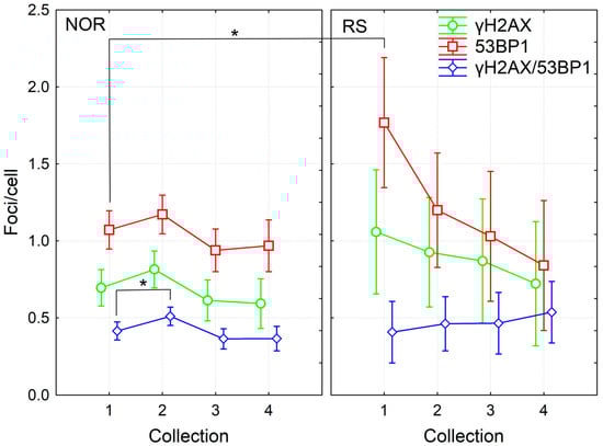 DNA repair γH2AX /53BP1 foci in PBL from BC patients collected before (1), 24 h after 4th fraction (2) and after RT (one month (3), one year (4)). The mean numbers from 52 NOR (G0-G1 acute skin toxicity) and 5 RS (G2 acute skin toxicity) patients along with 95% confidence interval are shown. p-values are indicated by asterisk (* p ≤ 0.05).