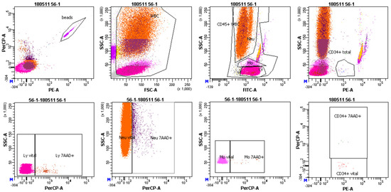 Representative image of FACS gating. First, white blood cells (WBCs) were gated. Afterwards, lymphocytes (Ly), monocytes (Mo) and neutrophils (Neu) were gated according to CD45 expression as observed in the FITC-A fluorescent channel. In the next step, CD34+ hematopoietic stem/progenitor cells were gated according to the expression of CD34 antibody as observed in the PE channel. Lastly, percentage of late/apoptotic cells (7AAD+), as shown in PerCP—a fluorescent channel was assessed in all cell populations.