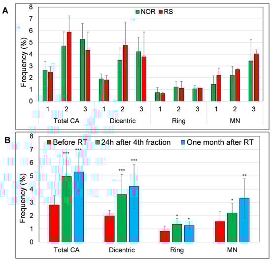 The level of chromosomal aberrations (dicentric, ring chromosomes and total aberrations (summation of dicentrics and rings)) and MN (A) in the PBL of RS and NOR patients and (B) level of CA and MN in all samples collected before (1), 24h after 4th fraction (2) and one month after RT (3). Frequency of CA and MN was defined as percentage of aberrant cells per 100 metaphases/MN per 100 binucleated cells (1000 metaphases/binucleated cells were analyzed, respectively). Data from 11 NOR and 2 RS patients are shown as mean and standard deviation. p-values are indicated by asterisk (* p ≤ 0.05; ** p ≤ 0.01; *** p ≤ 0.001).