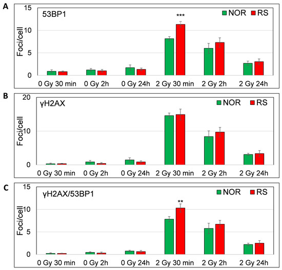 In vitro assessment of γH2AX /53BP1 DNA repair foci. Figure shows the level of 53BP1 (A), γH2AX (B) and co-localized γH2AX/53BP1 (C) foci 30 min, 2 h and 24 h after irradiation with 0 and 2 Gy of γ-rays. Mean values from four RS and four matched NOR patients (No. 24, 26, 30 and 40 from Table S1) are shown. p-values are indicated by asterisk (** p ≤ 0.01; *** p ≤ 0.001).