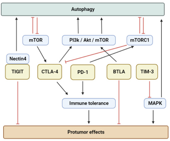 The intricated molecular correlations between immune checkpoints and autophagy in tumor-promoting immune tolerance are depicted in this diagram. The red arrows represent an inhibitory effect, while the black arrows represent a facilitative impact. The figure was created in part by using BioRender.com, accessed on the 3 April 2023.