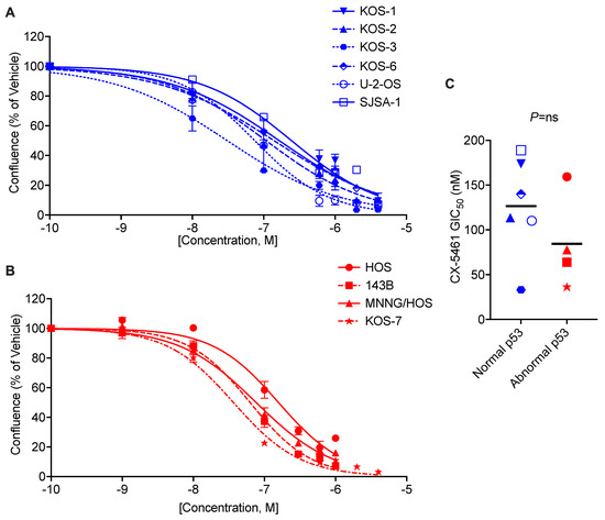 Statistical analyses were performed using GraphPad Prism software, version 9.1.0. The dose–response curve fit and 50% inhibitory values were obtained using non-linear regression. Comparisons of GIC50 and tIC50 between mutant p53 and wild-type p53 OS cell lines were conducted using a Mann–Whitney U test. Statistical significance between two groups (vehicle and CX-5461-treated groups) was assessed using two-way ANOVA.
