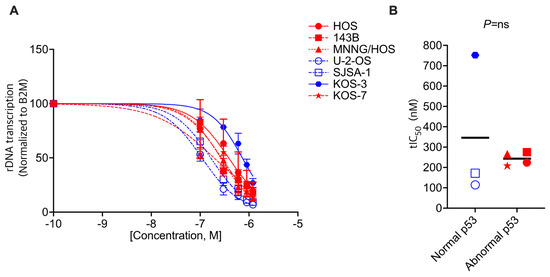CX-5461 suppresses rDNA transcription in p53 normal and abnormal human OS cells. (A) ATCC and KOS (KOS-3 and KOS-7) osteosarcoma cell lines were treated with CX-5461 or vehicle (50 mM NaH2PO4 (pH4.5)) for 1 h, and the rDNA transcription rate was determined by qRT-PCR using the results of the external transcribed spacer (ETS) normalised to β2 microglobulin (β2M). The dose–response curve and tIC50 were estimated using non-linear regression analysis, mean +/− SEM of n = 3 biological replicates. (B) Effect of p53 status on tIC50 of CX-5461. Each symbol represents the mean value of n = 3. Statistical analysis was conducted using a Mann–Whitney U test.