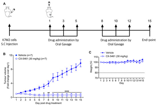 CX-5461 inhibits tumour cell growth in an immune-competent mouse model of osteosarcoma. (A) Schematic of immune-competent murine model of osteosarcoma: K7M2 murine OS cells (1 × 106 in 50 µL of HBSS) were injected subcutaneously into the right flanks of male and female BALB/c mice; then, when tumours could be measured using digital callipers, mice were randomised (ensuring equal distribution of sex and tumour size) to vehicle (50 mM NaH2PO4 (pH4.5)) or CX-5461 (30 mg/kg) group thrice weekly for two weeks. (B) Tumour volume was monitored and expressed in each mouse as the fold-change in the tumour size at the start of treatment, with the average of each treatment group depicted. (C) The weight of each mouse was monitored during the treatment period, with a 20% reduction in body weight being the ethical end point (dotted line), which was not reached. Mean +/− SEM of biological replicates as indicated. Statistical analysis was performed using two-way ANOVA; * p < 0.05, ** p < 0.005, **** p < 0.0001.