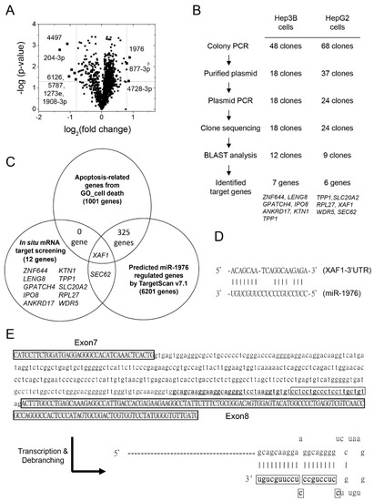 The isolation, validation, and sequence analysis of miR-1976-targeted segments were performed (Figure 1B). DNA segments of miRNA-1976-specific genes originating at miR-1976 binding sites were generated by PCR using random primers and Taq DNA polymerase. These segments were then ligated into TOPO-TA cloning vectors, and plasmids with the miR-1976-targeted clones were isolated. A total of 48 clones were generated using the miR-1976-specific cDNA pool from Hep3B cells, while 68 clones were generated using the miR-1976-specific cDNA pool from HepG2 cells. A total of 18 plasmids generated from Hep3B cells and 24 plasmids generated from HepG2 cells were isolated and sequenced using the M13 reverse primer. The gene identities were determined using nucleotide BLAST. Of them, seven genes (ZNF644, LENG8, GPATCH4, IPO8, ANKRD17, KTN1, and TPP1) were identified from Hep3B cell-derived clones, while six genes (TPP1, SLC20A2, RPL27, XAF1, WDR5, and SEC62) were identified from HepG2 cell-derived clones. The other clones could not be identified as definite genes due to the failure of DNA sequencing, as these DNA fragments in human chromosomes were not validated as known genes. These 12 genes were experimentally identified by in situ mRNA target screening.
