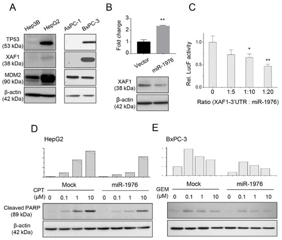 XAF1 is a potential target of miR-1976 as validated by Western blotting and a luciferase binding assay. (A) Expression of p53-dependent apoptotic proteins (TP53, XAF1, and MDM2) in hepatoma and pancreatic cancer cells. (B) Transfection of the miR-1976 expression plasmid increased the level of miR-1976 and decreased XAF1 expression. (C) Luciferase-binding assay showing dose-dependent inhibition of luciferase activity by miR-1976. Data are mean ± S.D. (n = 3); * p < 0.05; ** p < 0.01. The miR-1976 suppressed chemoagent-induced cell apoptosis in (D) hepatoma HepG2 and (E) pancreatic BxPC-3 cancer cells.