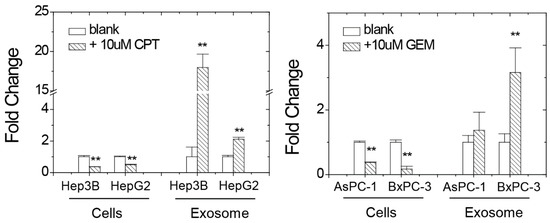 It was suggested that circulating miRNAs (miRNA-122, -155, -146a, and -125b) presented in exosomes regulates inflammation in mouse models of alcoholic liver disease, drug-induced liver injury, and Toll-like receptor ligand-induced inflammatory cell-mediated liver damage [12]. Our results on elevated levels of miRNAs in secreted exosomes upon chemoagent treatment could be used to evaluate the context of cancer cell damage by chemoagents [13]. Another study in the literature also suggested that the secreted exosomes from anti-cancer-drug-treated hepatoma cells were functional [16] and that they contained heat-shock proteins that efficiently induced HSP-specific NK cell responses.