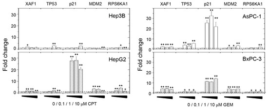 Effects of chemoagent treatment on gene expression levels in hepatoma Hep3B/HepG2 cells and pancreatic AsPC-1/BxPC-3 cells as analyzed by qPCR. Data are mean ± S.D. (n = 3); * p < 0.05; ** p < 0.01.