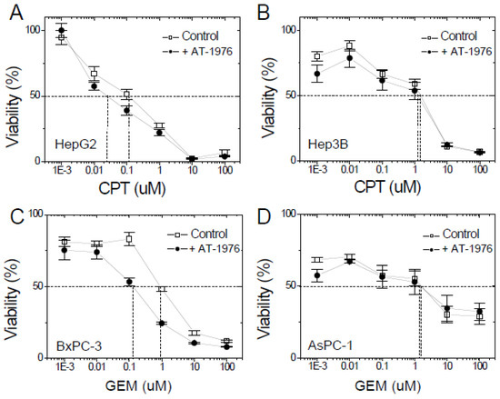 In this study, we showed the drug response of hepatoma and pancreatic cancer cells to increased p21 expression (Figure 4). However, the role of p21 in cancer is complex and context-dependent [41,42,43]. The p21 protein plays a critical role in regulating cell cycle progression and DNA repair. In normal cells, p21 is induced in response to DNA damage or other stresses, leading to cell cycle arrest and successive DNA repair. However, in cancer, the functions of p21 depend on the stage and type of cancer. It can be tumor-suppressive or oncogenic. The p21 protein acts as a tumor suppressor by inhibiting the activity of cyclin-dependent kinases (CDKs) that drive cell cycle progression. Loss or downregulation of p21 expression can lead to uncontrolled cell proliferation and tumor growth. On the other hand, in some types of cancer, p21 can be oncogenic, promoting tumor growth and survival, inhibiting cell apoptosis, activation of the PI3K/Akt/mTOR pathway, and induction of angiogenesis. Inhibiting p21 expression also contributes to chemoresistance by prompting repair. However, we observed increased p21 expression in response to chemoagent treatments (Figure 4). An increased level of p21 would be protective, which leads to cell cycle arrest and delayed progression (Supplementary Figure S3). However, our results did not suggest a mechanism for AT-1976 in promoting the p21 effect (Supplementary Figure S3).