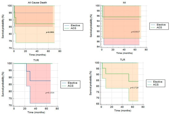 Kaplan–Meier survival curves between the elective and acute coronary syndrome (ACS) groups. MI = Myocardial Infarction; TVR = Target Vessel Revascularization; TLR = Target Lesion Revascularization.