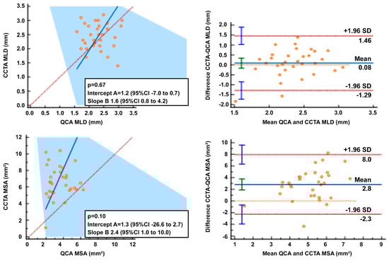 In 32 scaffolds, the mean difference between QCA and CCTA in MLD and MSA were −0.08 (limits of agreement (LOA) −1.29 to 1.46) and −2.84 (LOA −2.3 to 8.0) mm, respectively. The mean minimal in-stent diameter by CCTA was 2.38 ± 0.56 mm while the post-PCI QCA minimal lumen diameter was 2.4 ± 0.5 mm, a non-significant statistical difference. Overall, there was no agreement between QCA and CCTA on a Passing–Bablok regression analysis (Figure 5).