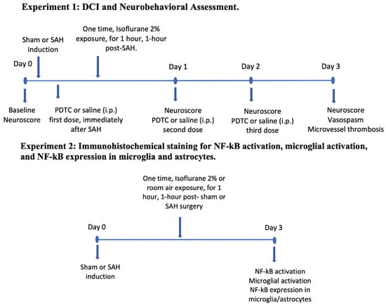 Experimental design of the study. SAH—subarachnoid hemorrhage. DCI—delayed cerebral ischemia. PDTC—Pyrrolidine dithiocarbamate. NF-kB—Nuclear factor kappa-light-chain-enhancer of activated B cells. i.p.—intraperitoneal.