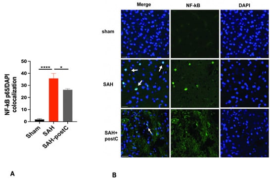 (A,B): Isoflurane conditioning attenuates NF-kB activation after SAH in an endovascular perforation model: Wild type male mice underwent SAH or sham surgery followed, 1 h later, by exposure to 2% isoflurane (PostC) or room air for 1 h. NF-kB/DAPI colocalization assessment was performed by immunofluorescence staining in brain around the vascular perforation area. Data represent mean ± SEM. (A) * p < 0.05 Sham vs. SAH, * p < 0.05, SAH vs. SAH-postC by ANOVA with Newman–Keuls multiple comparisons test. (n = 5). (B) Representative immunofluorescence staining images for NF-kB/DAPI colocalization. Arrow mark shows the NF-kB/DAPI colocalization. Scale bar = 50 μm. SAH—subarachnoid hemorrhage. postC—isoflurane post conditioning. (* p < 0.05, **** p < 0.0001).