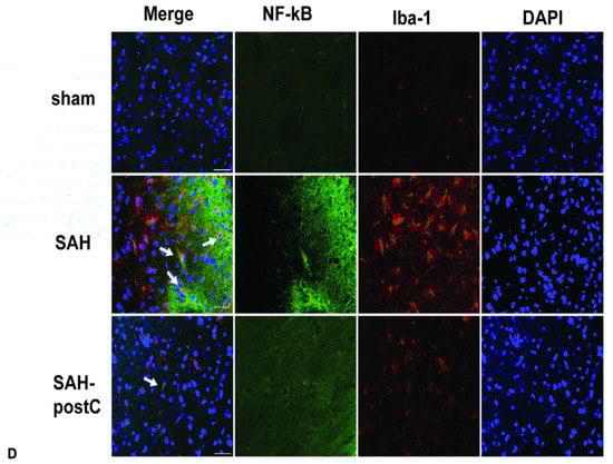 SAH causes strong activation of microglia, which was attenuated by isoflurane conditioning (p < 0.05, Figure 3A,B)). We also show that microglia are the major source of increased NF-kB expression after SAH, and that isoflurane conditioning strongly attenuates this pathologic molecular response (p < 0.05, Figure 3C,D).