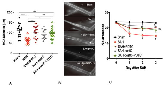 (A–C): Isoflurane conditioning and PDTC protects against SAH-induced vasospasm and neurological deficits in an endovascular perforation model: Wild type male mice were subjected to sham surgery or endovascular perforation SAH and treated with vehicle (saline) or three doses of PDTC 100 mg/kg with one PDTC group exposed to 2% isoflurane for one hour, one hour after SAH. A separate cohort of SAH mice was exposed only to 2% isoflurane for one hour, beginning one hour after SAH. Vasospasm was assessed on Day 3 (A). Neuroscore was assessed baseline and daily for 3 days (C). Data represent mean ± SEM. (A) * p < 0.05 Sham vs. SAH, * p < 0.05 SAH vs. SAH + PDTC, SAH-postC, and SAH-postC + PDTC, (ns) * p > 0.05 SAH + PDTC vs. SAH-postC vs. SAH-postC + PDTC. (C) # p < 0.05 Sham vs. SAH, * p < 0.05 SAH vs. SAH + PDTC, and p < 0.05 SAH vs. SAH-postC, $ p < 0.05 SAH vs. SAH-postC + PDTC. (ns) p > 0.05 SAH + PDTC vs. SAH-postC vs. SAH-postC + PDTC, by ANOVA and two-way repeated measures ANOVA with Newman–Keuls multiple comparisons test. (B) Representative images for vasospasm. The arrow mark points to ipsilateral left middle cerebral artery. ns—nonsignificant. SAH—subarachnoid hemorrhage. postC—isoflurane post conditioning. PDTC—Pyrrolidine dithiocarbamate. (** p < 0.01, *** p < 0.001, **** p < 0.0001).