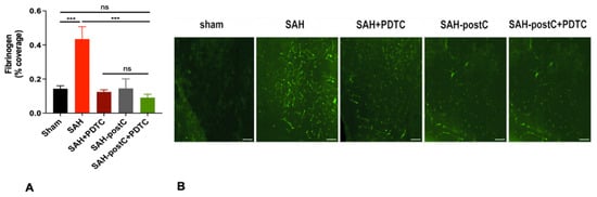 (A,B): PDTC protects against SAH-induced microvessel thrombosis in an endovascular perforation model: Wild type male mice were subjected to sham surgery or endovascular perforation SAH and treated with vehicle (saline) or three doses of PDTC 100 mg/kg with one PDTC group exposed to 2% isoflurane for one hour, one hour after SAH. A separate cohort of SAH mice was exposed only to 2% isoflurane for one hour, beginning one hour after SAH. Microvessel thrombosis was assessed on Day 3 ((A), n = 2–5). Data represent mean ± SEM. (A) * p < 0.05 Sham vs. SAH, * p < 0.05 SAH vs. SAH + PDTC, SAH-postC, and SAH-postC + PDTC, (ns) p > 0.05 SAH + PDTC vs. SAH-postC vs. SAH-postC + PDTC, by ANOVA with Newman–Keuls multiple comparison test. (B) Representative images for microvessel thrombosis. Scale corresponds to 100 μM. ns—nonsignificant. SAH—subarachnoid hemorrhage. postC—isoflurane post conditioning. PDTC—Pyrrolidine dithiocarbamate. (*** p < 0.001).