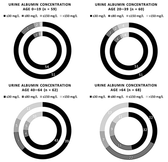 Comparison of 249 samples of albuminuria measured using the semi-quantitative and quantitative methods, redistributed on age. The inner circle represents the Cobas C 501 assay results, and the outer circle indicates the results of the Sysmex UC 3500.