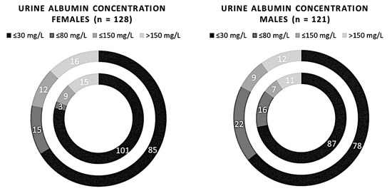 Stratification of urinalysis results of albumin/creatinine ratio based on sex.