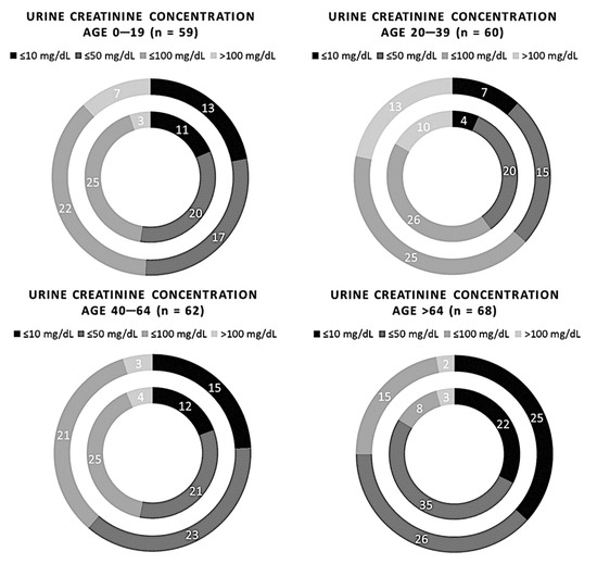 Comparison of 249 samples of creatinuria measured using the semi-quantitative and quantitative methods, redistributed on age. The inner circle represents the Cobas C 501 assay results, and the outer circle indicates the results of the Sysmex UC 3500.