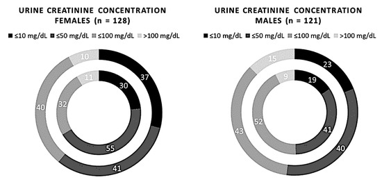Comparison of 249 samples of creatinuria measured using the semi-quantitative and quantitative methods, redistributed on sex. The inner circle represents the Cobas C 501 assay results, and the outer circle indicates the results of the Sysmex UC 3500.