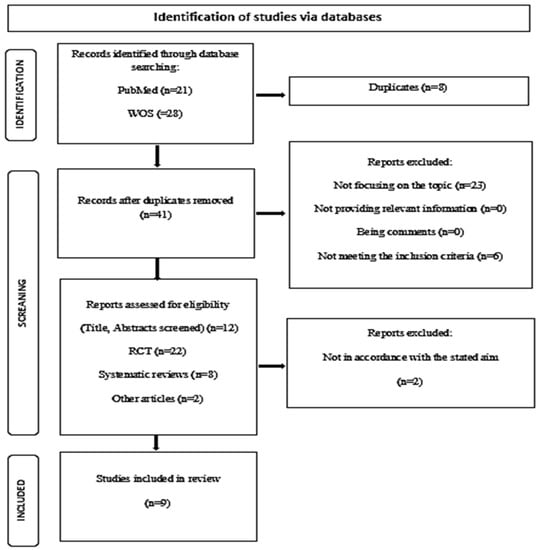 This systematic review (SR) followed the Preferred Reporting Items for Systematic Reviews and Meta Analyses (PRISMA) guidelines [24]. The protocol were registered in the International Prospective Register of Systematic Reviews (PROSPERO/NHS)-NUMBER CDR42022311302 [24,25]. Systematic research using PUBMed and Web of Science (WOS) was performed to identify trials suitable for inclusion in this SR. Keywords for the literature search were selected, with the authors’ agreement. Eligible criteria for the literature search for human studies were based on the PICO approach: (P—participants; I—interventions; C—comparison; O—outcomes) [25]. The terms used as keywords are listed in Appendix A, Table A1.
