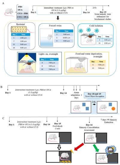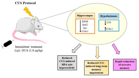 The CUS protocol was used to evaluate the role of an intermittent OUA treatment in the modulation of the HPA axis, long-term memory, and the extinction of fear memory, which are parameters that are well known to be altered in depression, anxiety disorders, and PTSD.