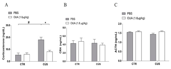 Chronic stress induces HPA axis hyperactivity, which is modulated by increased and sustained corticosterone levels []. Thus, the effect of a chronic intermittent treatment (every other day) of OUA on the serum corticosterone levels in animals that had been submitted to the CUS protocol was evaluated. It was observed that only the animals that received a chronic intermittent treatment with OUA at the dose of 1.8 μg/kg via intraperitoneal injection did not have altered basal levels of corticosterone (Figure 2A). However, the animals that were submitted to CUS showed an increase in their corticosterone levels 24 h after the last stressor stimulus, when compared with the control group (F (1, 24) = 0.58; p = 0.0001 for the CUS factor; p < 0.0001 for Ctrl-Ctrl x CUS-Ctrl) (Figure 2A). In this study, the animals that were submitted to CUS+OUA exhibited a reduction in their corticosterone levels when compared with the CUS-only group (F (1, 24) =8.108; p = 0.0089 for the treatment factor; p < 0.0001 for Ctrl-CUS x CUS-OUA) (Figure 2A). Nonetheless, alterations in the serum CRH and ACTH levels 24 h after the CUS protocol, when compared with the control group (CTR), were not observed (CRH: F (1, 51) = 3.117; p = 0.0835 for the CUS factor for Ctrl-for CTR x CUS); (ACTH: F (1, 35) = 1.254; p = 0.2704 for the CUS factor for Ctrl-for CTR x CUS). Additionally, the treatment with the OUA did not interfere with the level of CRH (Figure 2B), (F (1, 51) = 0.09387; p = 0.7606 for the treatment factor for CUS x CUS+OUA), as well as with the ACTH level [F (1, 35) = 3.376; p = 0.0747 for the treatment factor for CUS x CUS+OUA], when compared with the CUS.