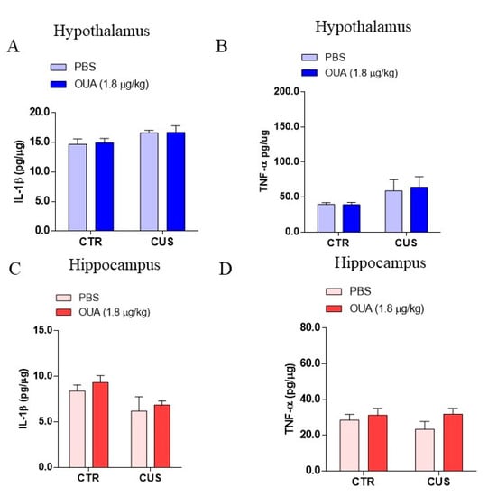 3.2. Effect of Chronic Unpredictable Stress (CUS) and Ouabain on Inflammatory Parameters in the Hippocampus and Hypothalamus