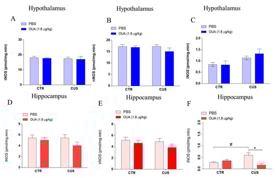 Different studies have reported that OUA is an essential regulator of the inflammatory response in the peripheral and CNS [,,]. Additionally, it is well known that chronic stress promotes, in humans and animals, an inflammatory state in the peripheral and CNS [,,]. Studies have associated these elevated levels of glucocorticoids with the presence of an increased inflammatory response in cells such as macrophages and microglia []. Additionally, IL-1β participates in the induction of memory impairment, as well as in the release of CRH [,]. However, in the chronic stress model that was performed in this study, it was not possible to observe any changes in the pro-inflammatory cytokines levels in the hypothalamus and hippocampus after 24 h from the last CUS protocol (Figure 3). These findings are in agreement with a previous study that performed CUS for 14 days in rats, where CUS alone did not modulate the expression of the pro-inflammatory cytokines []. Nonetheless, an increase in IL-1β and TNF-α in the hippocampus was observed after 1 h of the last CUS protocol, in male mice subjects with 14 days of CUS [], suggesting that perhaps these cytokines presented a peak immediately after the stress. However, some studies indicate that the priming effects of CUS in neuroinflammatory events pertain to peripheral immunological challenges [,]. Furthermore, the participation of the pro-inflammatory cytokines in the development of the neuroinflammation that is induced by chronic stress and the involvement of nitric oxide in the development of anxiety have been demonstrated, through the treatment with L-NAME, a NOS-inhibitor that is capable of reversing the chronic-stress-induced increase in anxiety-like behavior []. On the other hand, the nNOS activity in the hippocampus induces a decrease in the expression of glucocorticoid receptors (GR) in the hypothalamus, thereby reducing the negative feedback that is induced by corticosterone []. Given this, the effects of the CUS and OUA treatment on the NOS activity in the hypothalamus and hippocampus were investigated, although no changes were observed (Figure 4). The participation of iNOS in chronic stress has been previously described []. This study’s results showed that CUS increased the iNOS activity in the hippocampus (Figure 4), which is in accordance with a previous study []. Therefore, CUS may interfere with immunity through a system overactivation, leading to low-grade inflammation, as previously shown by Munhoz and colleagues [], where the 14-day CUS model exacerbated the activation of the factor NF-κB nuclear factor in the frontal cortex and hippocampus, induced by LPS via glucocorticoid secretion. Furthermore, OUA has been related to its anti-inflammatory potential in several models [,], and in the present study, it was demonstrated that OUA treatment reduced the iNOS activity in the animals that were submitted to the CUS protocol (Figure 4).