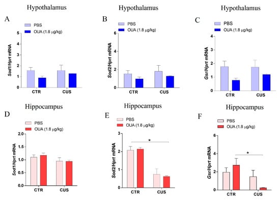 Chronic stress may increase the ROS levels, as well as reduce the activity of antioxidant enzymes such as glutathione (GSH) and superoxide dismutase (SOD) [,]. The imbalance between free radical production and the body’s antioxidant capacity has been presented as an important factor in the development of neuropsychiatric diseases, including depression in humans and in rodents [,]. The present study demonstrates that the CUS group showed a reduction in the mRNA expression of the antioxidant enzyme, SOD2, in the hippocampus, which OUA was unable to revert (Figure 5). Interestingly, the treatment with OUA in the animals that were submitted to CUS reduced the mRNA expression of the glutathione-disulfide reductase gene (Gsr). This result suggests that OUA would avoid an increase in ROS production during CUS, thus necessitating more GSH transcription. This hypothesis is in accordance with a study that observed that OUA treatment reduced the oxidative stress in a rat hippocampus in a model of LPS-induced neuroinflammation [].