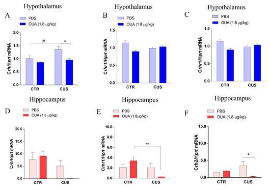 The CRH and its receptors are crucial to the regulation process of the HPA axis. Thus, the Chr, Crhr1, and Crhr2 mRNA expression were assayed in the hippocampus and hypothalamus through a qPCR, in order to evaluate the OUA treatment’s effect on the animals that were submitted to CUS. In the hypothalamus, the results demonstrate an increase in the Crh expression of the animals that were submitted to the CUS, in comparison to the control group (CTR) (F (1, 30) = 8.754; p = 0.0060 for the CUS factor), and the OUA treatment effect reduced this effect (F (1, 30) = 12.83; p = 0.0012 for the treatment factor) (Figure 6A). However, there were no changes in the expression of the Crhr1 in the hypothalamus of the groups that were evaluated (F (1, 34) = 0.08910; p = 0.7671 for the CUS factor) and (F (1, 34) = 5.311; p = 0.0274 for the treatment factor) (Figure 6B).