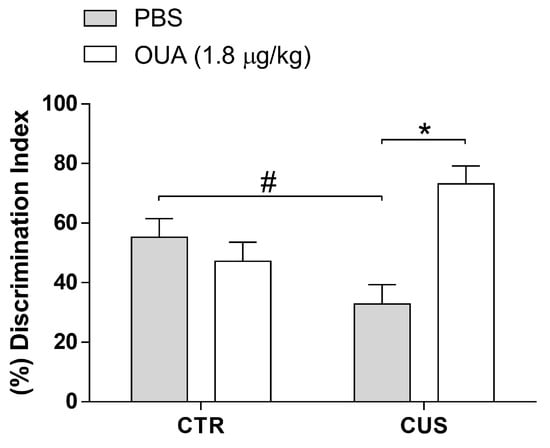 In fact, the OUA intermittent treatment reversed the CUS-induced disruption of the HPA axis, restoring the corticosterone levels. This is probably responsible for the improvement of long-term memory through object recognition that was observed in the CUS group treated with the OUA (Figure 7). Higher levels of corticosterone reduce this object recognition 24 h after training [].