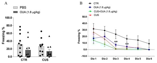 In order to assess context-dependent fear memory and extinction, the rats were exposed to a fear conditioning protocol 24 h after the last chronic unpredictable stressor stimulus, and analyzed for their recall and extinction of context-dependent fear for seven consecutive days. This fear memory consolidation shows a decreased efficacy with time after training and repeated presentations of the context, without an aversive stimulus causing a gradual reduction in the fear response, which is a form of learning that is referred to as fear extinction []. The results suggest that either the OUA or CUS promoted a faster extinction of fear memory, compared with the control group, without interfering with the acquisition of aversive memory (Figure 8).