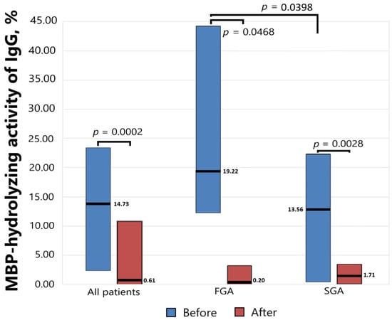 The level of MBP-hydrolyzing activity of IgGs was normalized to standard conditions (1 mg/mL MBP proteins; 0.2 mg/mL IgGs; 20 h of incubation at 37 °C). The complete hydrolysis of the MBP as substrates was taken as 100%. The significance of the differences (p) was calculated using the Mann–Whitney U test. MBP—myelin basic protein. FGA—first-generation antipsychotics. SGA—second-generation antipsychotics.