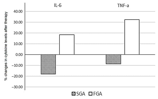 Patients treated with SGAs demonstrated a significant decrease in levels of IL-6 (p = 0.036). The median values of IL-2, IFN-y, and TNF-α were reduced after therapy, without statistical significance. When assessing the percentage of changes in the cytokine levels between patients treated with FGAs and SGAs, statistically significant opposite changes in the levels of IL-6 (p = 0.033) and TNF-α (p = 0.036) were found (Figure 3).
