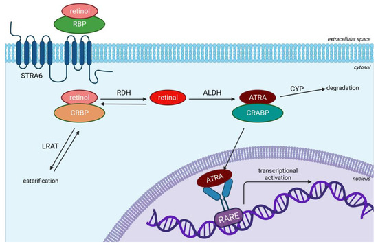 - Ghyselinck, N.B.; Duester, G. Retinoic acid signaling pathways. Development 2019, 146, dev167502. [Google Scholar] [CrossRef]