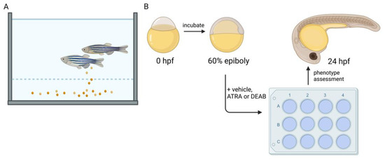 Zebrafish as a model organism. (A) Zebrafish adults reach sexual maturity between 2–3 months of age and mate via broadcast spawning into the water column. (B) Thus, fertilized embryos can be collected non-invasively and grown in the lab. Embryos develop optimally at a temperature of 28.5 °C, as they are tropical fish, and can be grown in various formats. Here, we show the example of arraying the embryos in multi-well plates to conduct exogenous treatments with small molecules to interrogate developmental processes and for toxicology studies. The use of RA pathway agonists or antagonists, like ATRA or DEAB, can be used to interrogate how changes in RA biosynthesis or signaling affect ontogeny. Such treatments can begin at any timepoint of interest to the researcher, such as the 60% epiboly depicted here, and then embryos reared to the stage(s) of interest, such as 24 hpf, to examine the effects by any number of phenotype assessments, such as live assessment, WISH, or qRT-PCR. Figure created with BioRender.com.