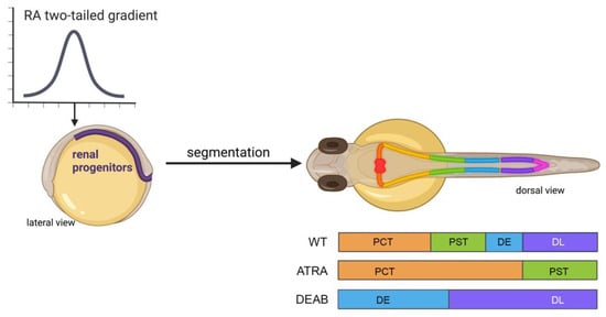 RA levels influence proximo-distal nephron fates during embryonic kidney development in the zebrafish. (Left) Renal progenitors are exposed to a gradient of RA during gastrulation and axis formation, with the highest level at the rostral-most locations (arrow). (Right, top) As development proceeds, these RA levels exert an influence on the proximo-distal segmentation patterning. The zebrafish embryonic kidney comprises two bilateral nephrons with several unique cell populations, and these undergo morphogenesis events by the 48 stage to connect rostrally at a single midline blood filter and caudally at the cloaca where waste exits the body. (Right, bottom) The effects of RA are best understood for the 4 main tubule populations: the proximal convoluted tubule (PCT), proximal straight tubule (PST), distal early (DE), and distal late (DL). Embryos exposed to a high dosage of ATRA starting at 60% epiboly form nephrons with only proximal segments. Conversely, embryos exposed to the RA biosynthesis inhibitor DEAB starting at 60% epiboly form nephrons with only distal segments. Figure created with BioRender.com and based on [175].
